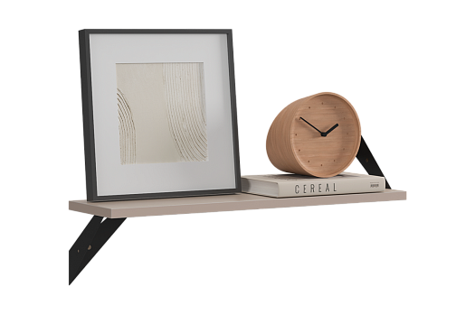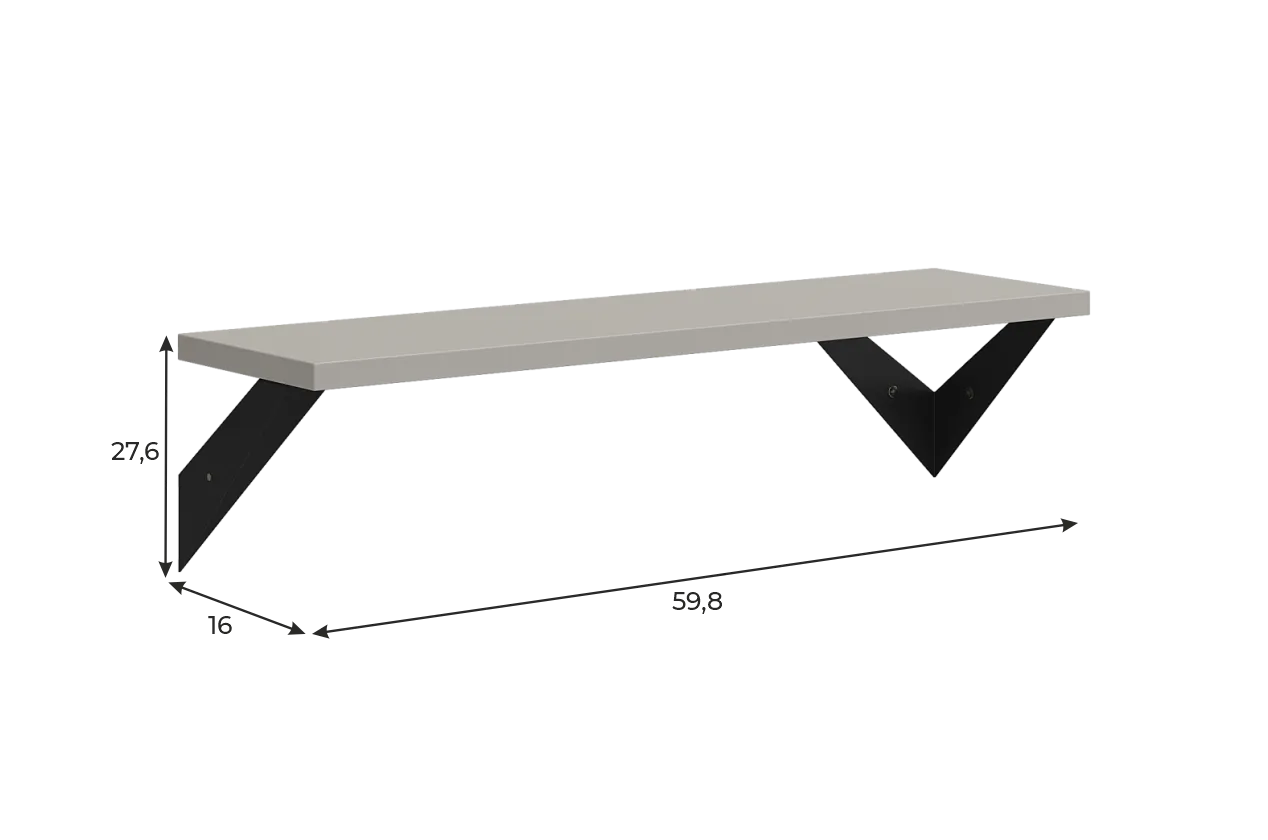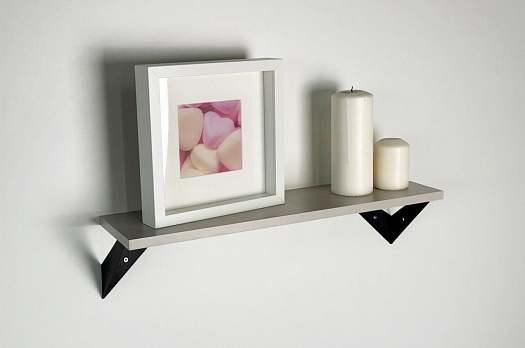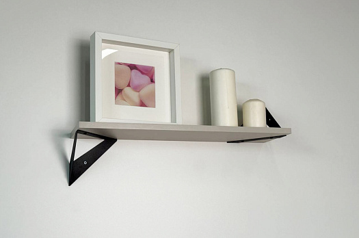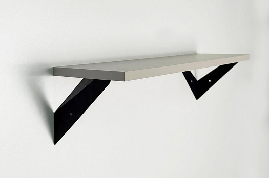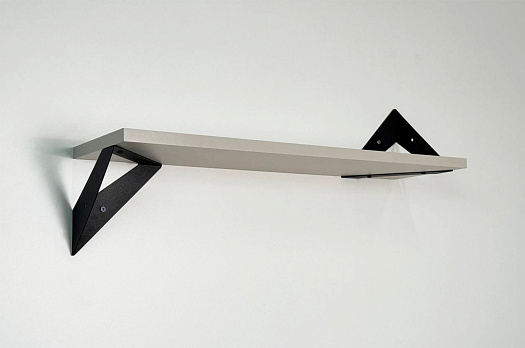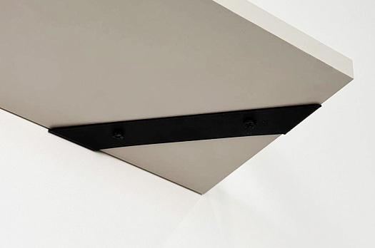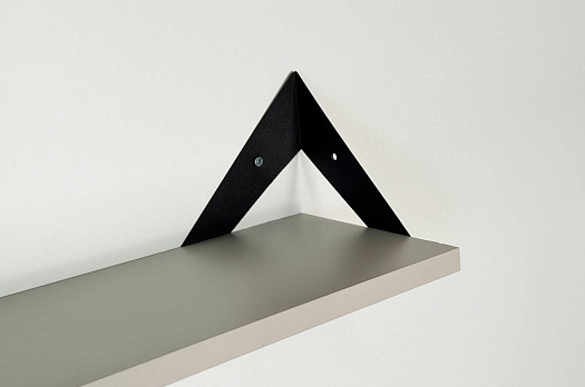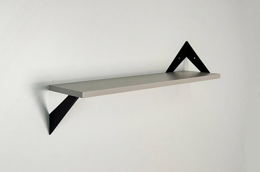 Полка крепится к стене с помощью чёрных треугольных держателей, которые обеспечивают устойчивость и долговечность. Особенность модели в том, что держатели можно расположить сверху, снизу или один сверху, другой снизу, что позволяет адаптировать полку под любые интерьерные решения и потребности.