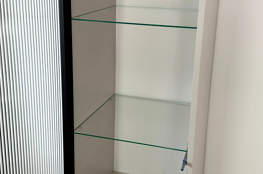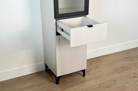 Шкаф оснащён надёжной металлической ручкой и имеет удобное внутреннее наполнение: надёжные полки за стеклянной и глухой дверцами, а также выкатной ящик. Это позволяет рационально использовать пространство.