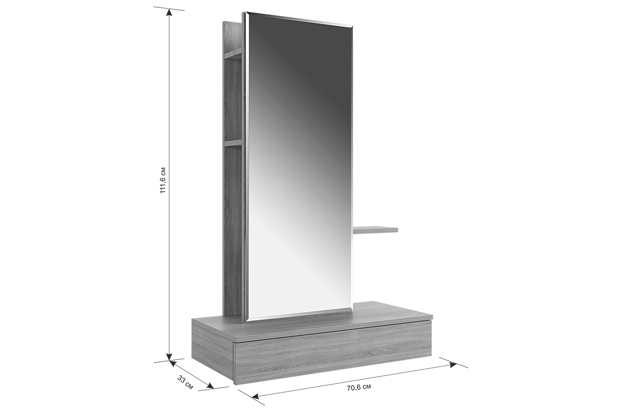 Трюмо Мария создано для тех, кто ценит универсальность и комфорт в интерьере. Эта модель легко приспосабливается к вашим предпочтениям: повесите трюмо на любой высоте и выберите удобное расположение зеркальной панели — справа или слева. Небольшие полки предлагают пространство для вашей косметики и парфюмерии, а выкатной ящик позволит держать необходимые мелочи под рукой. Крючок предусмотрен для украшений или бытовой техники, такой как фен.
