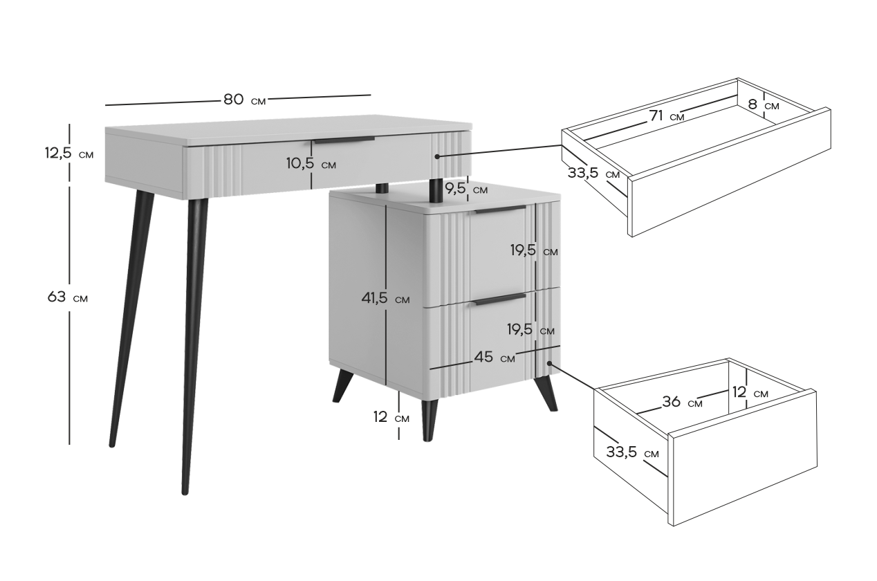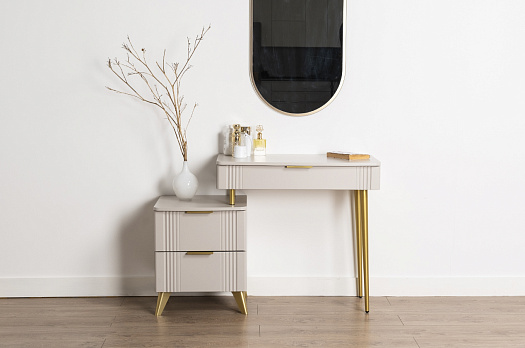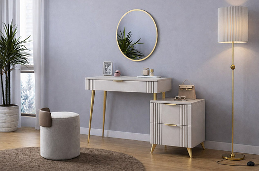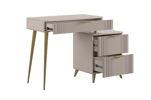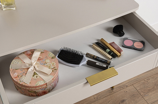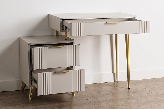 Благодаря своему дизайну трюмо «Катрин Голд» легко впишется в любой интерьер. Выкатные ящики предоставляют достаточно места для хранения различных предметов, а возможность использования трюмо в качестве письменного стола делает его универсальным элементом мебели.