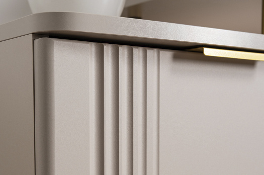 Трюмо изготовлено из качественных материалов: корпус выполнен из ЛДСП, что гарантирует прочность и долговечность, а фасад из МДФ в плёнке ПВХ не только выглядит эстетично, но и защищает трюмо от повреждений. Особое внимание заслуживает фрезеровка фасадов, которая придаёт изделию изысканный вид.
