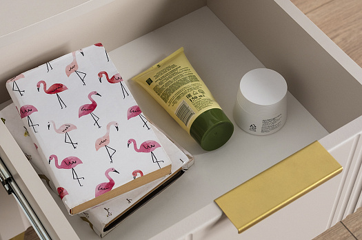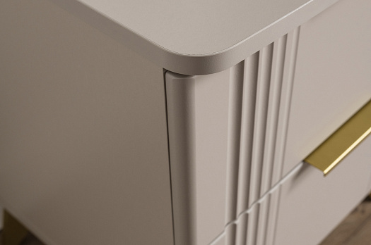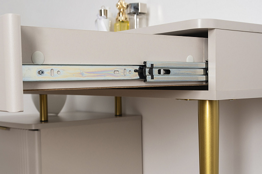 Металлические золотистые ручки и выкатные ящики на шариковых направляющих обеспечивают удобный доступ к вещам. Нерегулируемые золотистые опоры гарантируют стабильность конструкции.