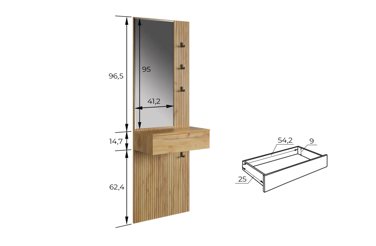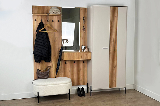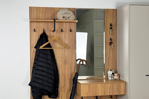 Крючки предоставляют удобное место для хранения сумок или аксессуаров. Выкатной ящик служит дополнительным пространством для хранения мелочей, таких как ключи, кошелек, косметика или другие небольшие предметы.
