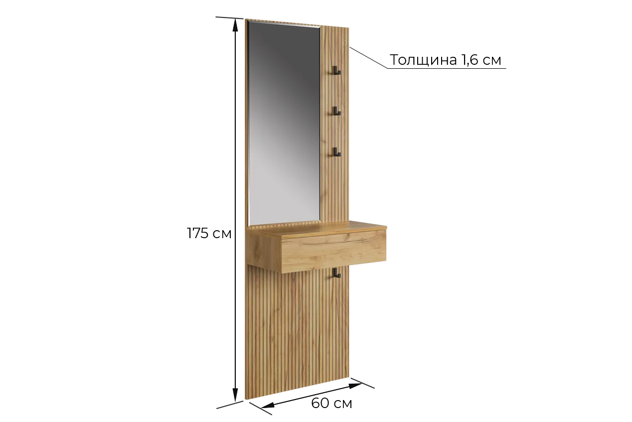Принт, имитирующий вертикальную фрезеровку, придает зеркалу уникальный и современный вид, добавляя текстуру и глубину. Материал каркаса – ЛДСП, что обеспечивает прочность и долговечность, а также легкость в уходе.