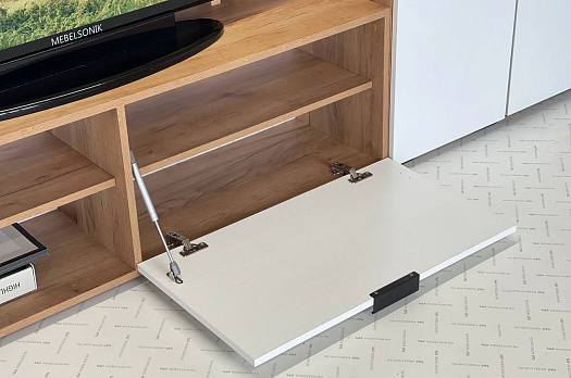 Состоит из: тумбы с открытыми и закрытыми секциями и полками над ТВ зоной.