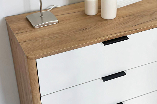 Благодаря полукруглым профилям на боковинах комода, вы легко и безболезненно обойдете углы, даже если поставите комод в самое узкое пространство.