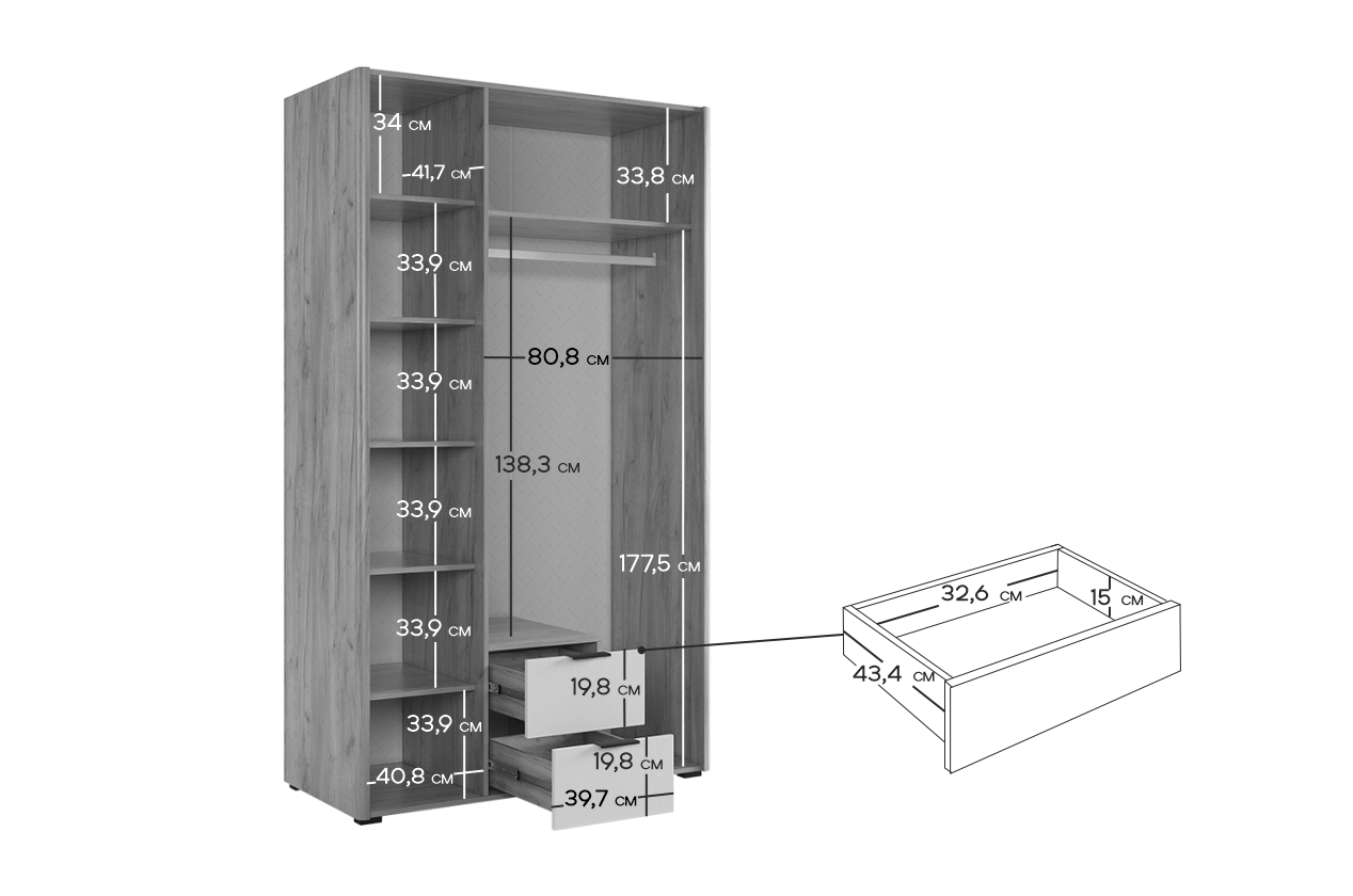 Состоит из: шести полок, двух ящиков выдвижных, штанги для одежды и зеркала на фасаде.
