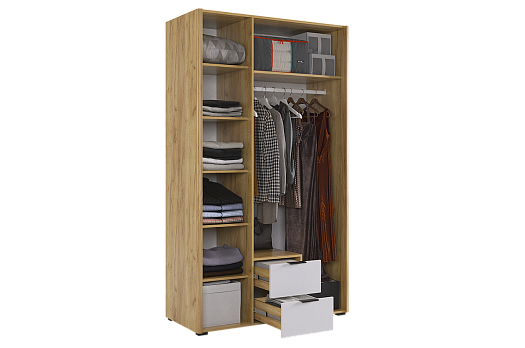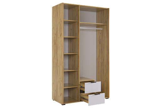 Вместительный шкаф имеет полки, ящики выдвижные и штангу для одежды, а полукруглые, обтекаемые углы обеспечат безопасность и комфорт.