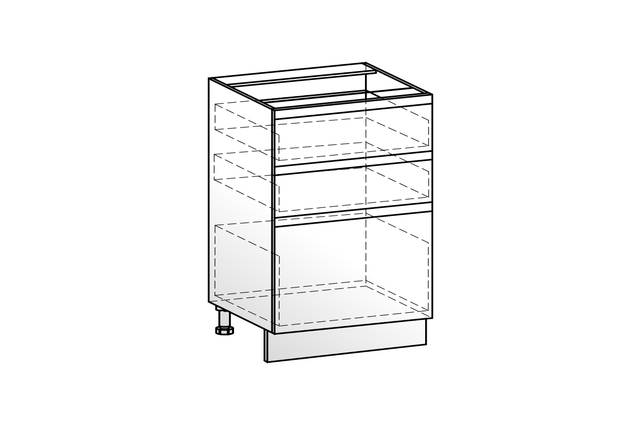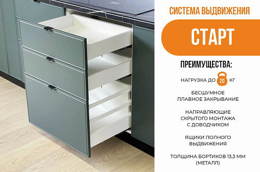 Рабочий шкаф с тремя вместительными выкатными ящиками — практичное решение для удобной организации хранения. Верхний ящик идеально подходит для размещения столовых приборов и мелких аксессуаров, средний и нижний — для кастрюль, сковород и другой кухонной утвари. Фасады выполнены из МДФ 19 мм, а система СТАРТ обеспечивает плавное, тихое и комфортное использование каждый день.