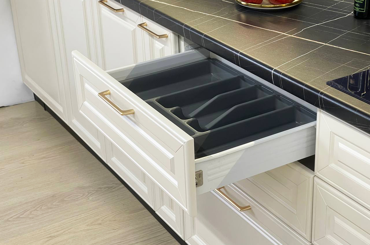 Дополнительная опция для хранения столовых приборов и сохранения корпуса кухни от влаги.