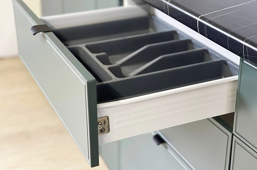 Дополнительно можно комплектовать: лотком для столовых приборов, столешницей, стеновой панелью, объемным плинтусом, стыковочными и торцевыми планками и цельным пластиковым цоколем на весь кухонный гарнитур.