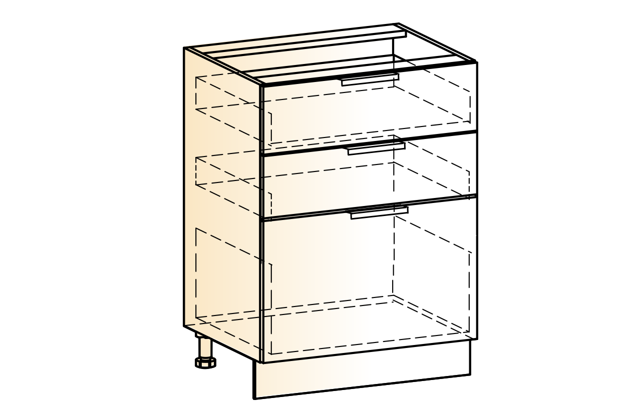 Состоит из:  шкаф рабочий с 3-мя выкатными ящиками с системой выдвижения СТАРТ - безшумное открывание.