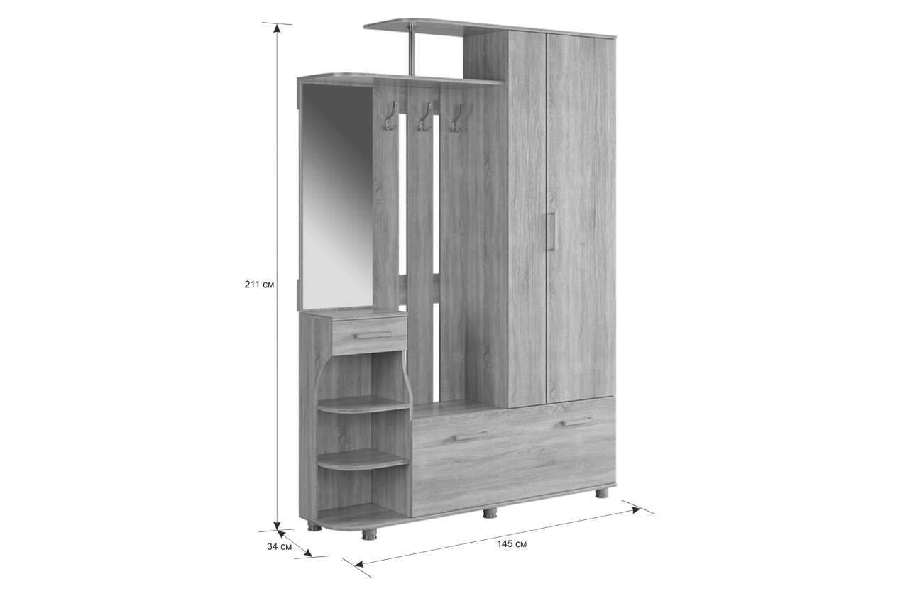 Прихожая Барселона-2 воплощает в себе открытую вешалку с крючками для теплой верхней одежды, закрытый шкаф, удобную обувницу и специализированное место для головных уборов. К тому же, модель укомплектована панелью с зеркалом, ящиком и полками для различных мелочей, которые должны быть всегда под рукой. Удобство использования дополняется регулируемыми по высоте ножками.