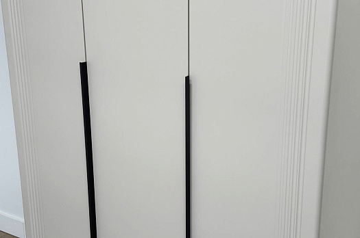 Особое внимание стоит уделить фрезеровке фасадов, которая придаёт шкафу изысканный и неповторимый вид. Длинные пластиковые ручки гармонично дополняют общий стиль шкафа.