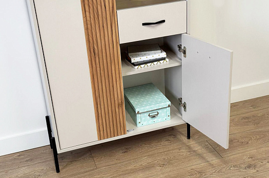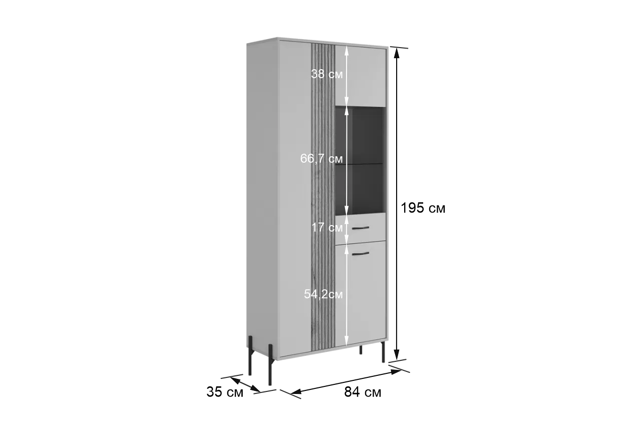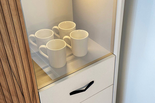 Вторая дверь, выполненная со стеклянной вставкой, позволяет демонстрировать коллекции, декоративные предметы или книги, придавая вашему пространству дополнительный шарм и элегантность.