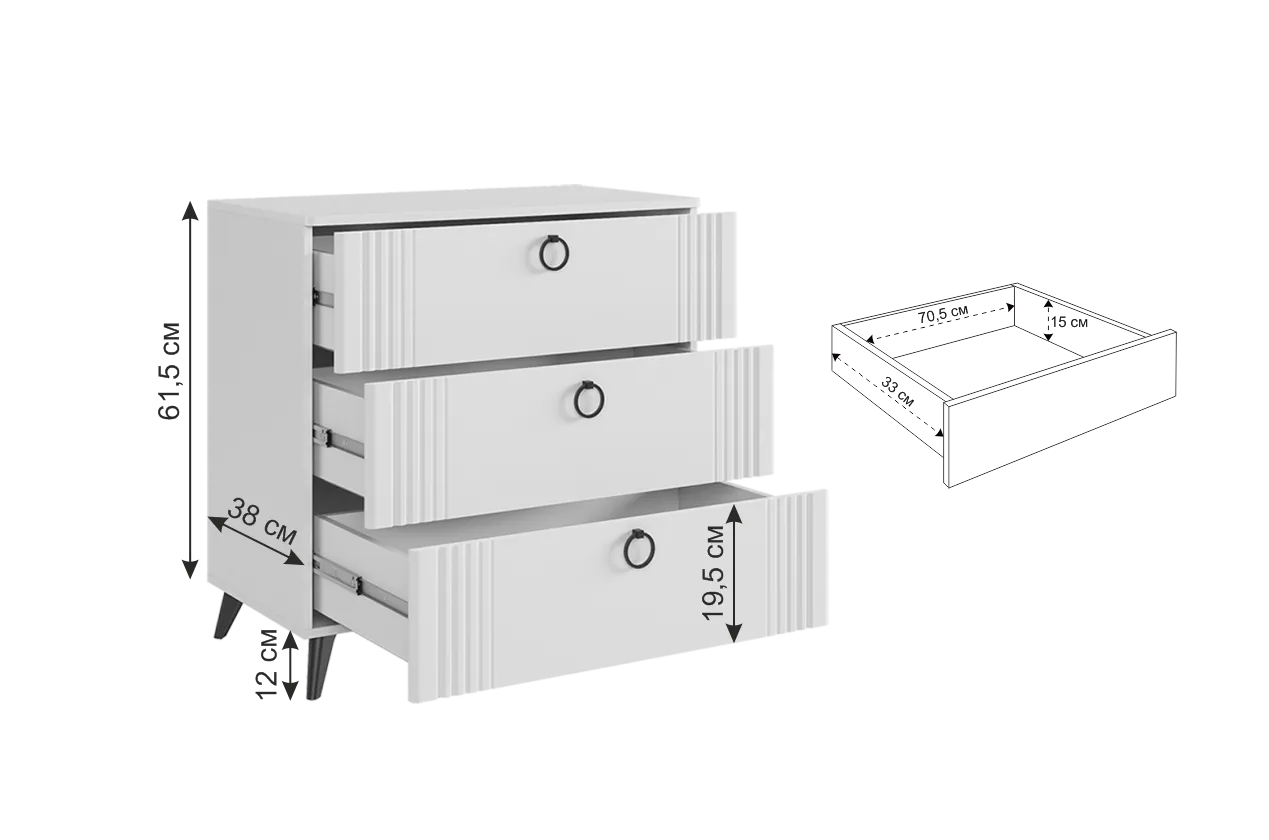 Комод "Ева" идеально сочетает в себе стиль и функциональность. С его размерами 800х428х736 мм он будет отличным дополнением к любому интерьеру. Корпус комода выполнен из ЛДСП в белом деревянном цвете, а фасады - из МДФ, облицованного пленкой ПВХ белого матового цвета. Смело можно сказать, что комод выглядит элегантно. Он оснащен тремя просторными ящиками на шариковых направляющих, что обеспечивает плавное и бесшумное скольжение. Удобные ручки-кнопки добавляют комоду элегантности и обеспечивают удобство использования. Также комод имеет бесшумную систему закрытия фасадов, что делает его идеальным выбором для спален или детских комнат. Пластиковые черные опоры высотой 120 мм придают комоду устойчивсть и добавляют удобство уборки. Комод "Ева" - это не просто место для хранения, это изысканный акцент в интерьере вашего дома, который радует своей красотой и функциональностью на протяжении многих лет. Он создает атмосферу уюта и комфорта, идеально сочетаясь с любыми элементами интерьера и придавая вашему дому неповторимый шарм и элегантность.