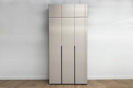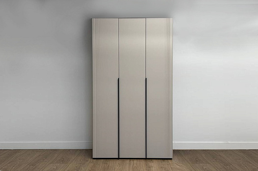 Особое внимание стоит уделить фрезеровке фасадов, которая придаёт шкафу изысканный и неповторимый вид. Длинные пластиковые ручки гармонично дополняют общий стиль шкафа.