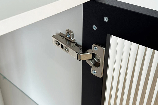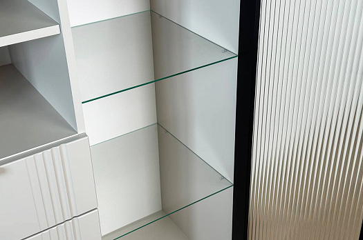 Дизайн комода продуман до мелочей: с одной стороны расположена стеклянная дверца, за которой находится просторное пространство для хранения. С другой стороны – ниша с открытой полкой, выкатной ящик и ещё одна глухая дверца, что позволяет гибко организовать хранение и поддерживать порядок в доме.