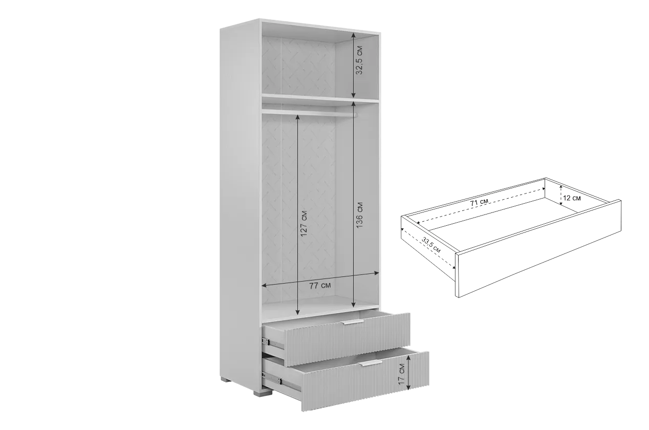 - Внутри шкафа вы найдете штангу для одежды, полки.А также два удобных ящика с шариковыми направляющими.