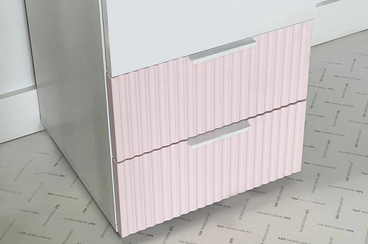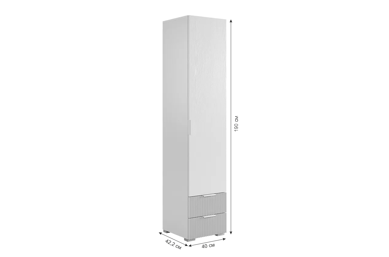 Шкаф изготовлен из прочного материала – ЛДСП в цвете белое дерево. Фасад распашной двери выполнены из ЛДСП в цвете белое дерево. Фасады выкатных ящиков выполнены из качественного МДФ с использованием эмали. Вертикальные полосы на фасаде - фрезеровка, которая создает эффектный акцент.