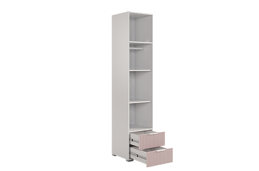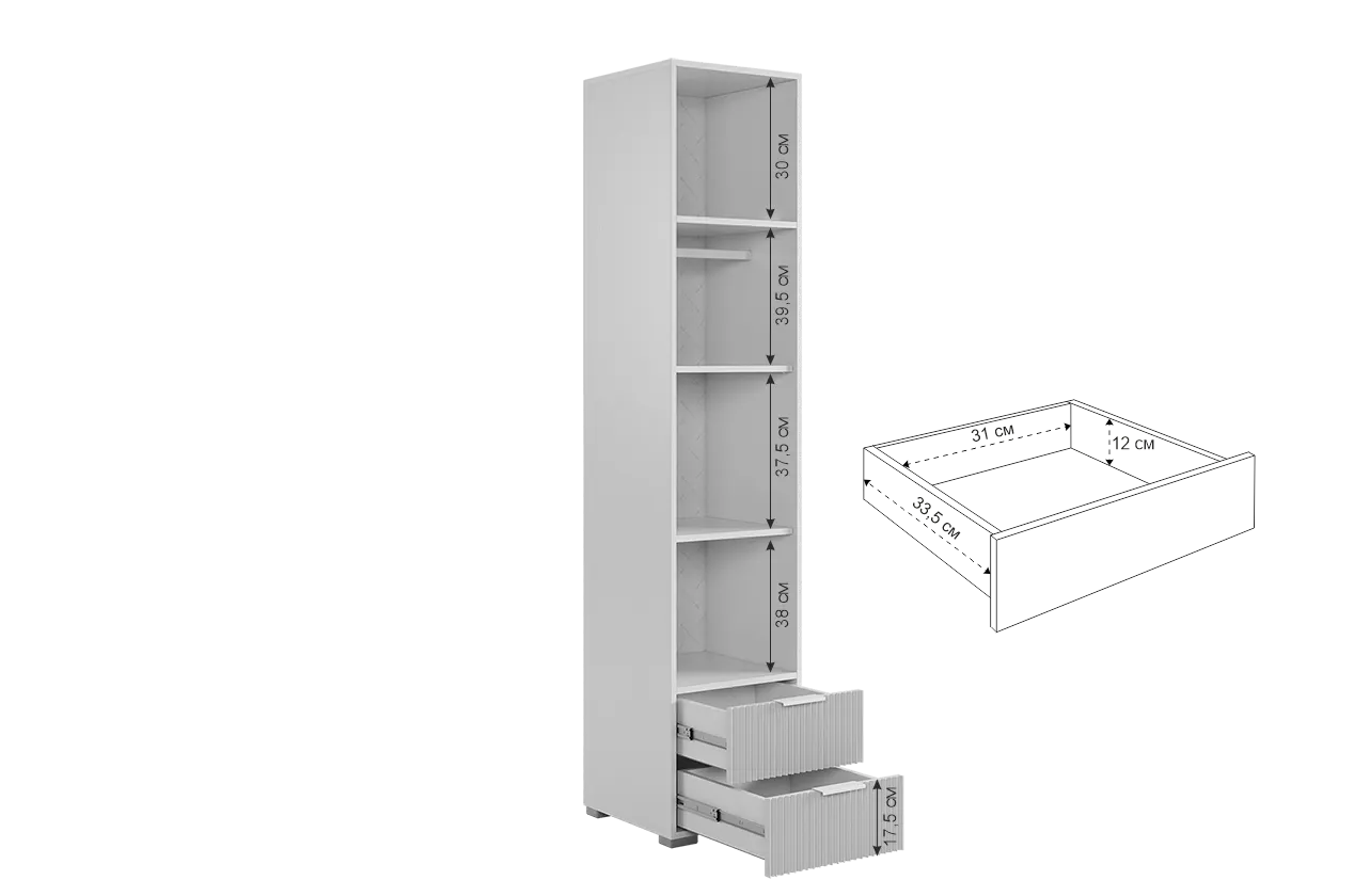У шкафа два удобных ящика, оснащенные шариковыми направляющими для плавного и бесшумного закрывания фасадов. Благодаря универсальной сборке, можно менять открывание фасада влево или вправо. Наполнение можно менять: оставить полки или убрать их, чтобы повесить одежду на штангу.